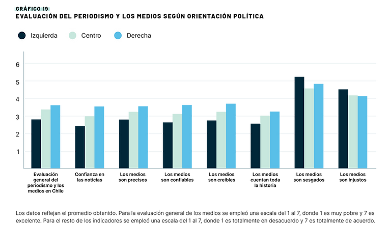 La ideología política de las audiencias está significativamente vinculada a la evaluación general que estas hacen del periodismo y los medios en Chile. Quienes se declaran más cercanos a la izquierda tienden a ser más críticos en su evaluación que quienes se declaran más cercanos a una ideología de derecha (ver gráfico 19).